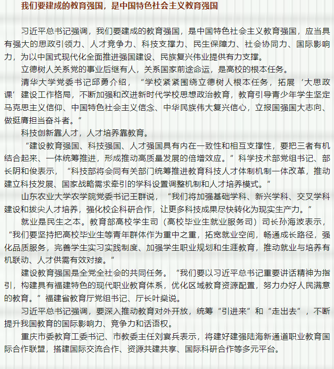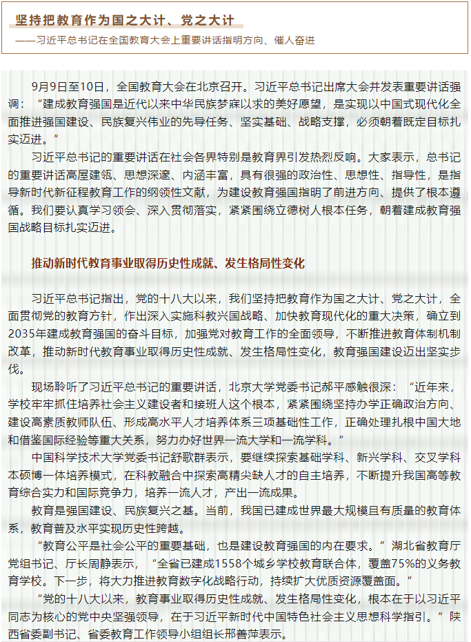 9月(yuè)9日(rì)至10日(rì),全國(guó)教育大(dà)會₽≈<φ(huì)在北(běi)京召開(kāi)。習(xí)近(jìn)•♣↑平總書(shū)記出席大(dà)會(huì)并發表重要(yào)講話(huà)強調 ∏:“建成教育強國(guó)是(shì)近(jìn)代以來(lái)中華民(mín)族夢寐以求的(≥≠de)美(měi)好(hǎo)願望,是(shì)實現(xiàn)以中國(guó ®)式現(xiàn)代化(huà)全面推進強國(guó)建設、民(mín)族複興偉₩γ✘業(yè)的(de)先導任務、堅實基礎、戰略支撐,必須朝著(zhe)既≤♦∑₹定目标紮實邁進。”習(xí)近(jìn)平總書(shū)記的(de)重要(yào)♦£講話(huà)在社會(huì)各界特别是(shì)教育界引發熱(rè¥σ)烈反響。一(yī)起來(lái)看(kàn)《人(rén)民(mín)日(r ≤☆ì)報(bào)》報(bào)道(dào)——